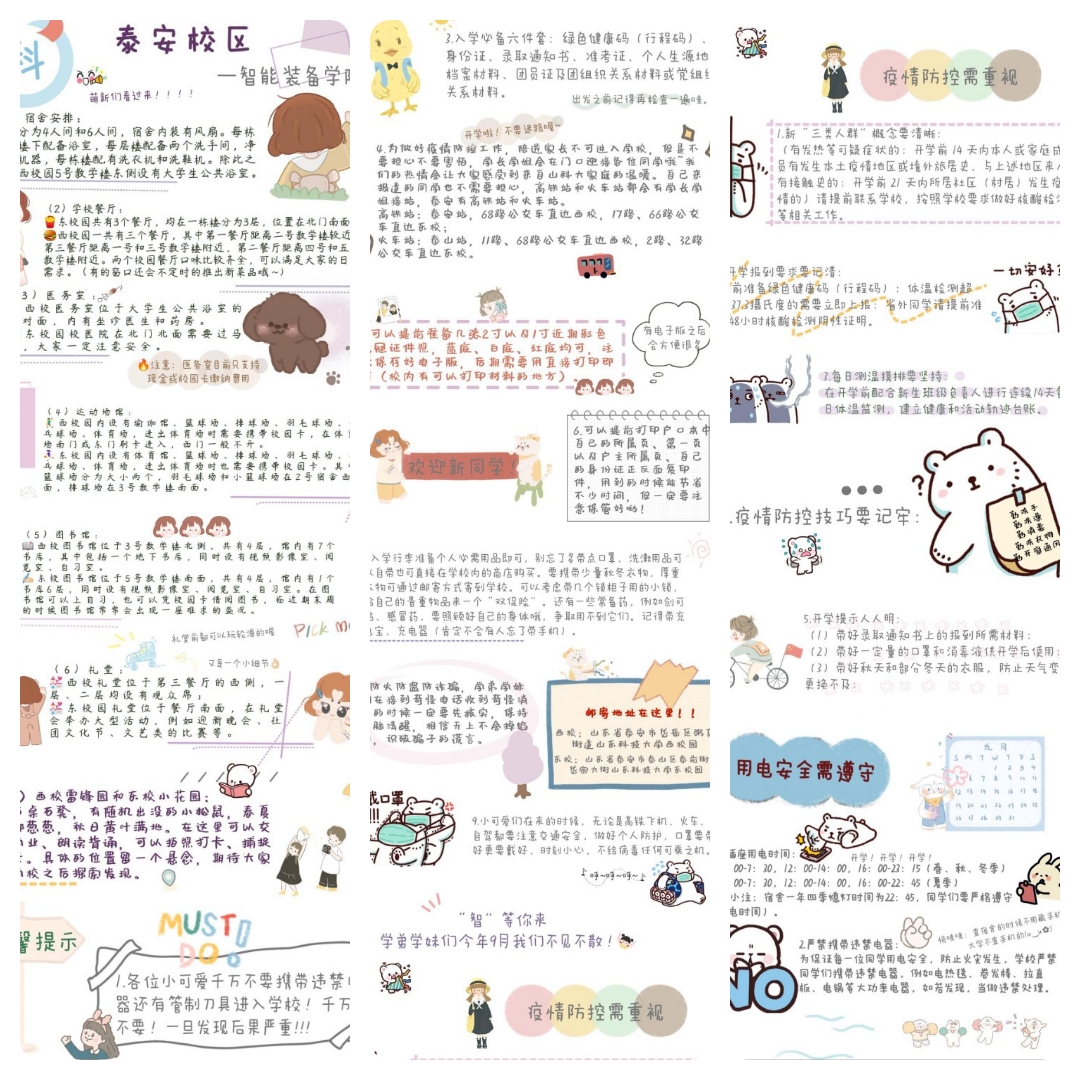 制作过程中,智能装备学院结合21级新生的专业和心理特点、接受习惯,制定了制作卡通版校园地图的方案。精心制作的地图作为迎新大礼送给了2021级新生,卡通萌风格的手绘校园地图一经推出,就受到了广大新生的欢迎。除了展示校园布局,这份地图还用文字明确标明了新生入学报到的地点,校园内的各主要建筑、学院、教学楼和图书馆等都一一标注清楚,使人一目了然。一图在手,即可畅游校园。另外,地图还附有山东科技大学泰安校区简介、宿舍安全、防疫提醒、出行提示等信息。入学新生表示,校园地图简单明了,信息丰富,可以帮助快速熟悉校园环境、了解吃住行、更快地融入新的学习环境,会将地图好好珍藏。(文:仝帆 图:智能装备学院)