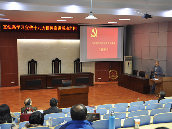 12月5日,文法系在模拟法庭举行学习宣传党的十九大精神报告会。教工党支部书记史钟锋以《不忘初心 牢记使命 继续奋斗》为题进行宣讲,文法系全体教工听取报告,系党总支书记马福泉主持会议。