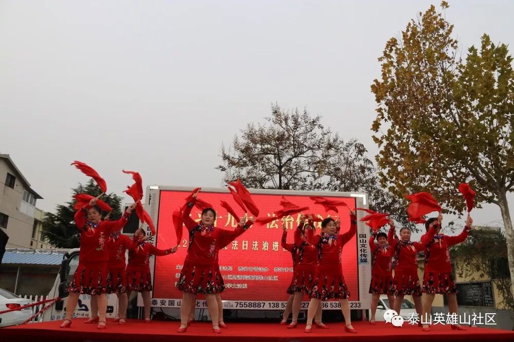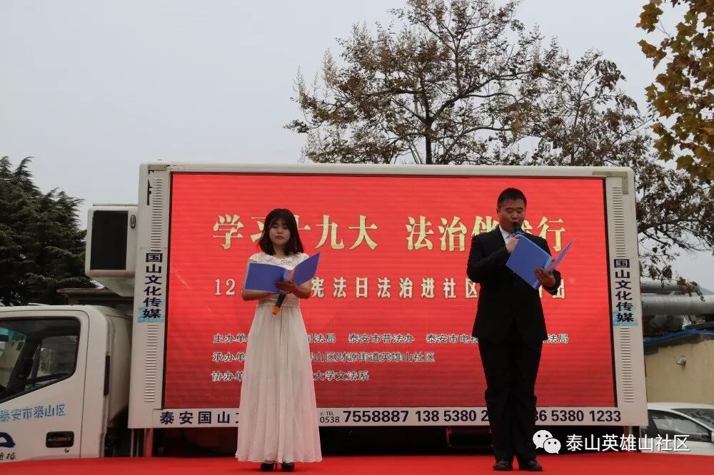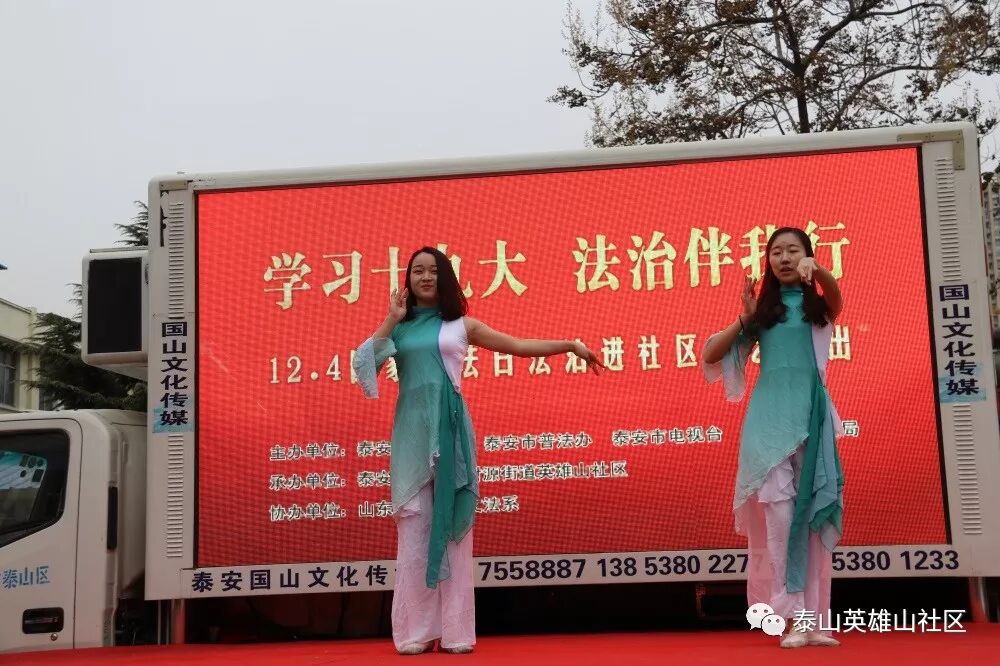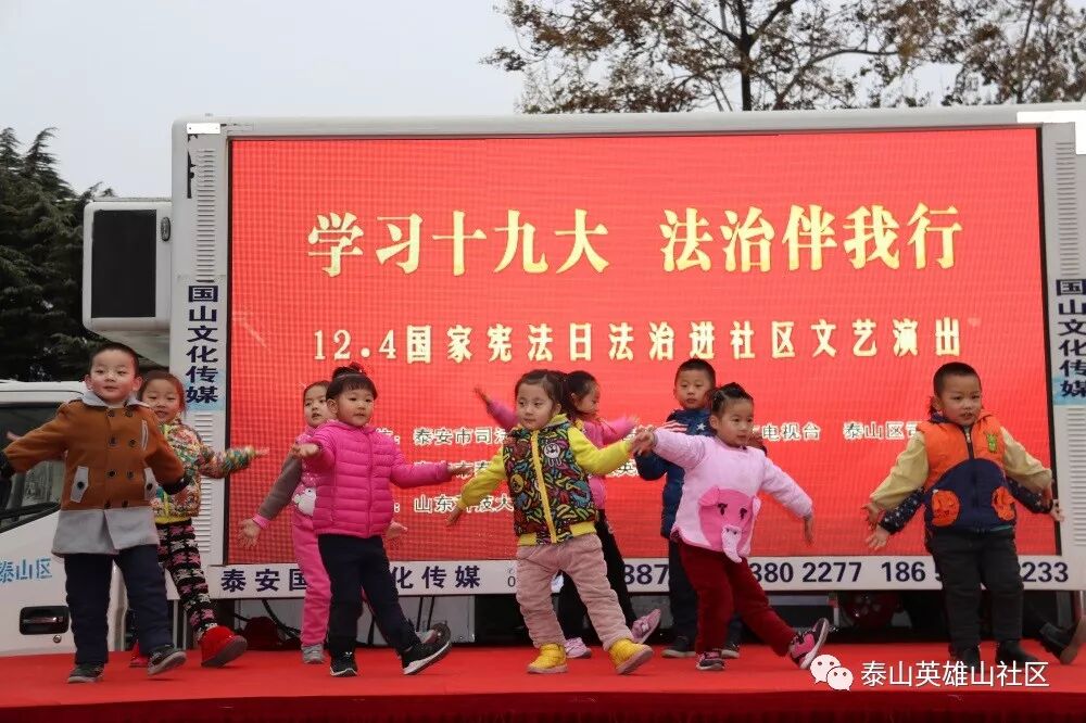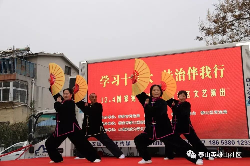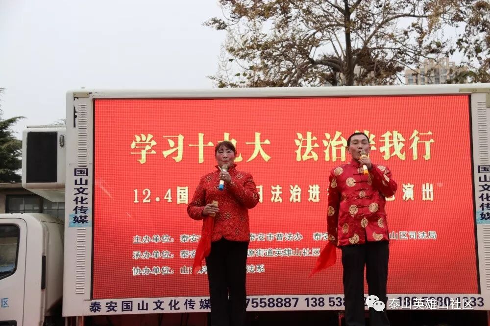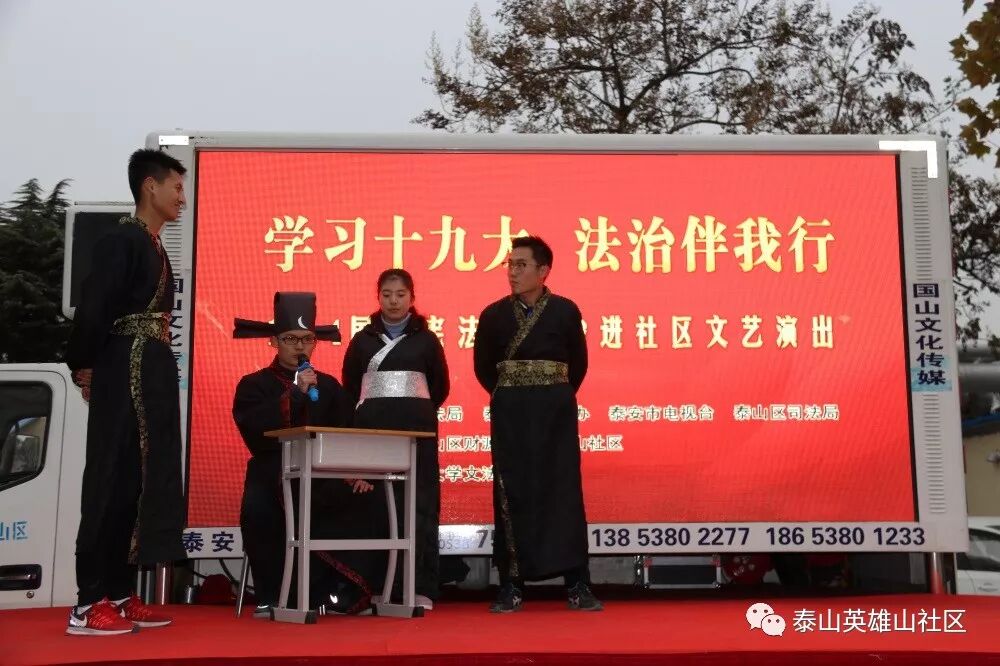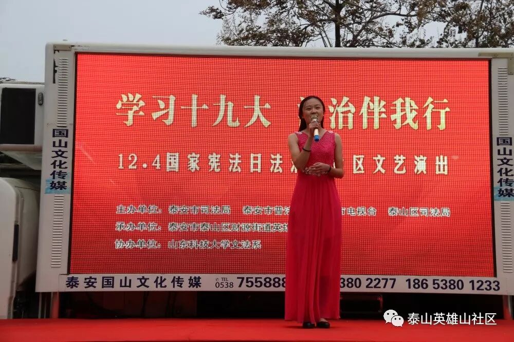 在全国上下深入学习贯彻党的十九大精神和“12.4”国家宪法日即将来临之际,财源街道英雄山社区与泰安市司法局、泰安市普法办、泰安市电视台、泰山区司法局、山东科技大学文法系联合举办“学习十九大 法治伴我行”普法文艺演出活动,切实营造起学习贯彻十九大精神和全民学法、守法、懂法、用法的浓厚氛围,为全社区各项事业发展提供强有力的法制保障。
