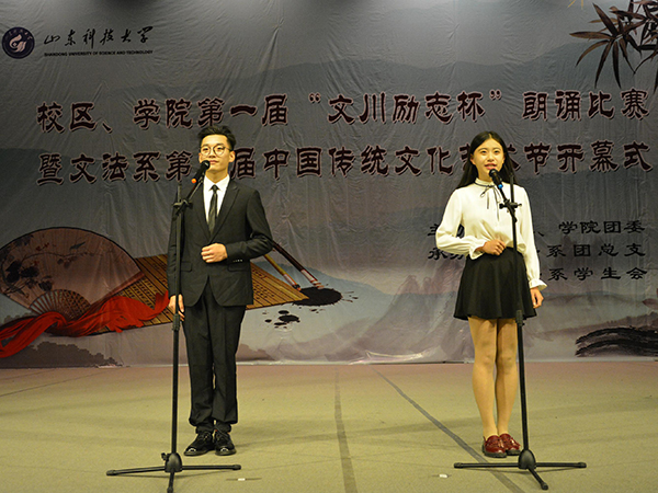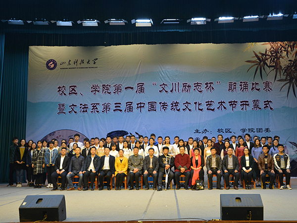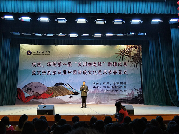10月27日,由校区、学院团委主办,文法系团总支、学生会承办的校区、学院第一届“文川励志杯”朗诵比赛暨文法系第三届中国传统文化艺术节开幕式在礼堂隆重举行。著名诗人文川老师、山东广播电视台节目主持人王乐斌老师、泰安电视台国家一级导演李传泰老师和国家级骨干教师徐岚老师应邀出席并献上精彩的朗诵节目,校区、学院团委副书记朱庆豪、文法系党总支副书记刘相明、团总支书记郭涛林、各系团总支老师及文法系优秀校友蔡照坤与1000余名同学共享晚会盛宴。