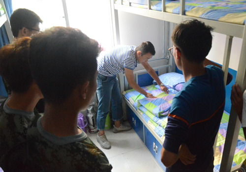 退伍学长们对新生宿舍内书本、鞋子及其他生活用品等的摆放做出指导,并示范叠被子的技巧和要点,各新生宿舍派出代表进行学习。