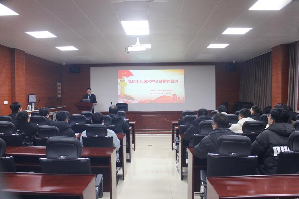 12月28日,资源学院院长王清标在2号楼201会议室为学院研究生及所联系的本科班级学生代表宣讲党的十九届六中全会精神。