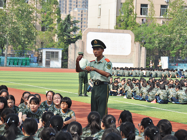 教官正在给同学们示范动作,教官的提脚踏步十分标准,同学们看的聚精会神。