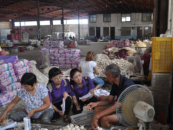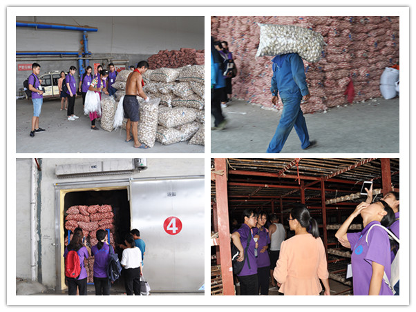 冷库里,实践团观看大蒜储藏入库的过程,认识到大蒜的人力成本很高,队员们对工人们技艺的娴熟表示惊叹。