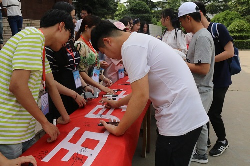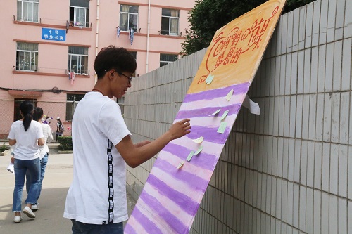 此次活动分为“感恩母亲”卡片展,亲情连线,校园采访三个环节。第一环节,同学们把自己内心想对母亲说的话写在卡片上并到宣传海报上。第一环节,同学们把对母亲的诚挚祝福语写在卡片上并亲自贴在展板上,一张张祝福语交织成一张网,洋溢着孩子对母亲深深的爱;第二环节,参与活动的同学和母亲电话连线,向母亲表达真挚爱意,并在主题横幅上签名承诺;第三环节,实践团成员采访校园同学最想对母亲说的一句话,一位同学在采访中说:“我们不应只在母亲节这天才与母亲有这么直接的沟通,平常我们也应该多和母亲打电话,尽孝要趁早”。活动在《世上只有妈妈好》的歌声中圆满结束。(文:陈钰洁;图:潘莹)