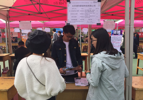 4月15日,泰安校区2017年春季毕业生供需见面会在东校操场举行。机电系电自动化13-1班的毕业生刁胜凯没有像其他同学一样忙着投递简历参加应聘,而是早早坐在了北京凌阳爱普科技有限公司的招聘摊位上等待像他一样的17届毕业生们前来应聘。