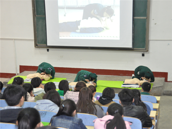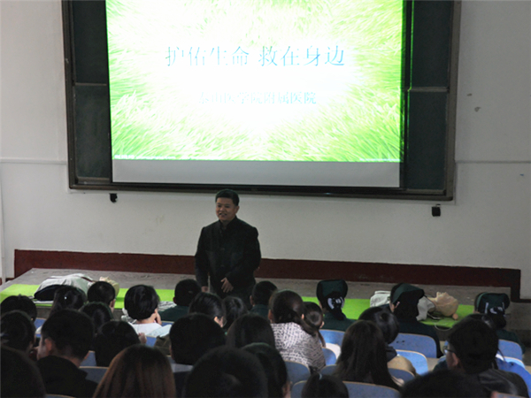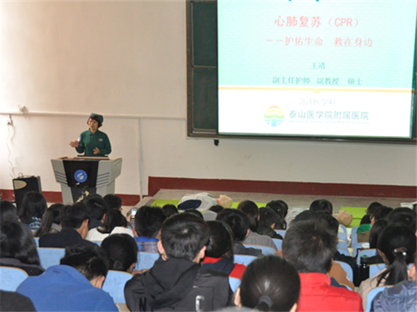 3月15日下午,由文法系团总支主办的“心肺复苏”安全知识讲座在1A107开展。讲座特邀泰山医学院附属医院副教授王靖讲解心肺复苏的知识,由文法系党总支副书记兼副主任刘相明主持,泰山医学院附属医院六名护士及百余名文法学子参加。