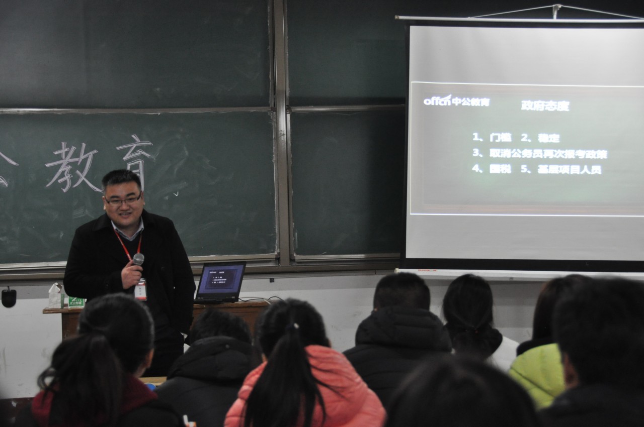 2月23日晚,由文法系和中公教育联合承办的省公务员考试培训会在1C102举行,培训会由中公教育山东研究院院长谷宗涛主持,百余名文法学子参加。