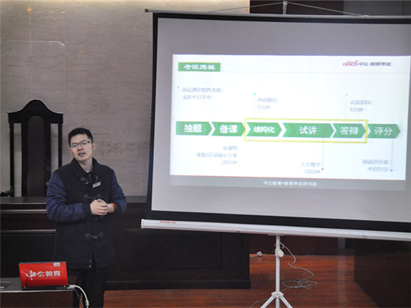 12月18日,文法系和中公教育联合承办的教师资格证面试指导在模拟法庭举行,由资深讲师胡天坤主讲,百余名文法学子参加。