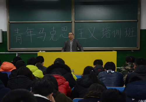12月14日,系团总支书记谢清勇在2301教室为“青年马克思主义学习班”进行“学生党员和入党积极分子要正确把握与处理好九种关系”的专题培训。