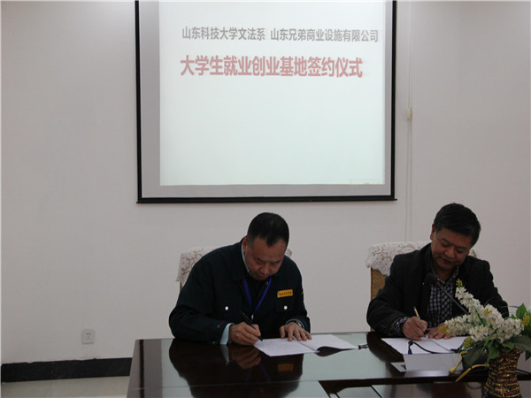 12月8日,文法系大学生就业与创业实习基地签约暨挂牌仪式在山东兄弟商业设施有限公司举行。公司总经理刘涛、文法系党总支副书记兼副主任刘相明、人力资源中心经理赵霞、总经理办公室刘洋、人力资源中心专员付宝峰、文法系团总支书记郭涛林、团总支老师刘明远等人出席签约挂牌仪式。