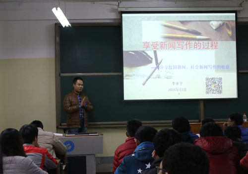 12月1日,机电系邀请我校校友前齐鲁晚报泰安记者站记者李亚宁在5#201作新闻写作专题培训讲座。李亚宁向同学们介绍了自己从学生记者成长为专业记者的经历,结合新闻采写过程中的见闻畅谈了作为新闻人对“铁肩担道义,妙手著文章”的理解,分享了近年自己的代表性新闻作品并结合作品对新闻写作的方法与技巧进行了重点讲解。他希望同学们学会通过编辑视角进行谋篇布局,通过创新与策划让新闻“出彩”,通过问题预设引导被采访对象思路,通过“回头看”让稿件更加完善。