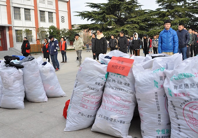 11月24日,由校区、学院团委主办,大学生志愿者联合会承办,山东农业大学阳光志愿者协会、山东财经大学东方学院财政金融系社团服务部协办,以“旧衣一份,‘衣’旧情深”为主题,驻泰高校志愿者首届旧衣捐赠仪式在文化广场圆满落幕。校区、学院团委书记王靖磊,副书记朱庆豪,泰安市慈善总会郭启建和部分驻泰高校志愿者代表参与本次活动,仪式由校区、学院团委社会实践部部长王衍国主持。