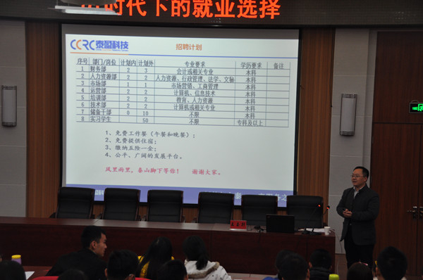 11月22日,我校校友、泰盈科技(集团)有限公司总经理助理、财务总监王玉升和招聘部经理尹作斌等一行4人到文法系举办专场招聘会。