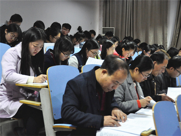 11月1日,文法系党总支组织全体党员59人,在系模拟法庭进行“两学一做”学习测试。