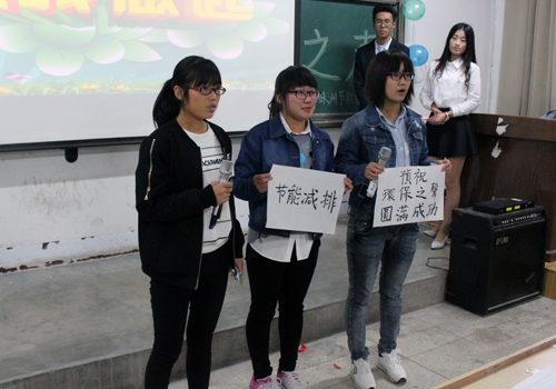 活动分为知识问答、才艺展示、小组抢答三部分。同学们运用所学的环境保护知识和生活常识轻松应对各类题目;在才艺展示中,同学们将自己对保护环境的情感融入到朗诵中,表达对地球的热爱之情,更有同学通过ppt展示雾霾的危害和治理方法;抢答环节紧张刺激,各小组努力争取抢答机会。最后,潘文凤队突出重围,夺得头筹。