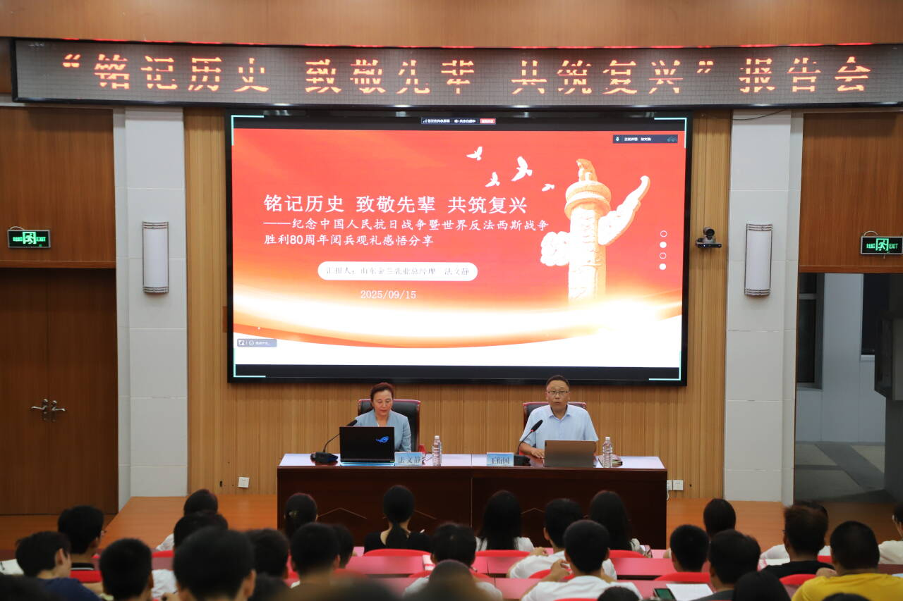 9月15日,智能装备学院于西校园八角楼报告厅举办“铭记历史 致敬先辈 共筑复兴”报告会,特邀山东金兰乳业有限公司总经理、山东省铸牢中华民族共同体意识教育实践基地负责人法文静作为主讲人。报告会由学院党委副书记兼副院长王衍国主持,全体2025级新生参加。
