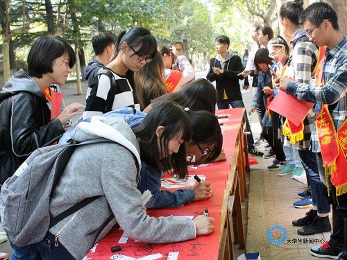本次活动以“倡导厉行节俭,反对铺张浪费”为主题,旨在培养学生树立“节约粮食、文明用餐”的良好风尚。同学们纷纷在“一粥一饭,当思来之不易;半丝半缕,恒念物力维艰”的条幅上签上自己的名字。志愿者们向同学们发放“光盘行动”宣传单页,精简明了地向同学们讲解光盘行动的内容,告诫同学们要节约爱惜粮食。(文:李宵 图:高波 编辑:杨莹)