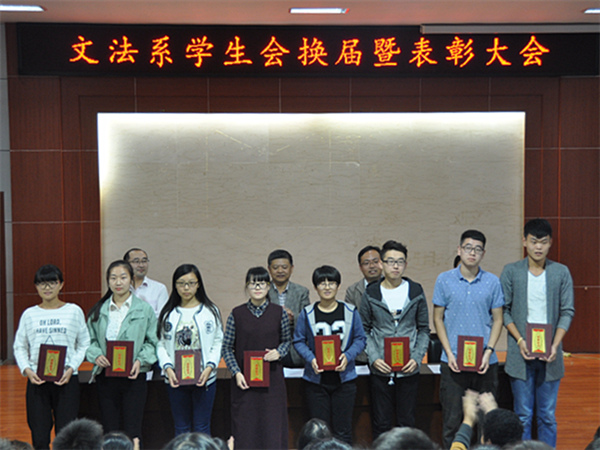 10月13日,文法系在模拟法庭举行学生会换届暨表彰大会,系党总支副书记兼副主任刘相明和团总支老师出席,第十一届学生会全体成员、获奖代表等150余人参加,会议由刘明远主持。