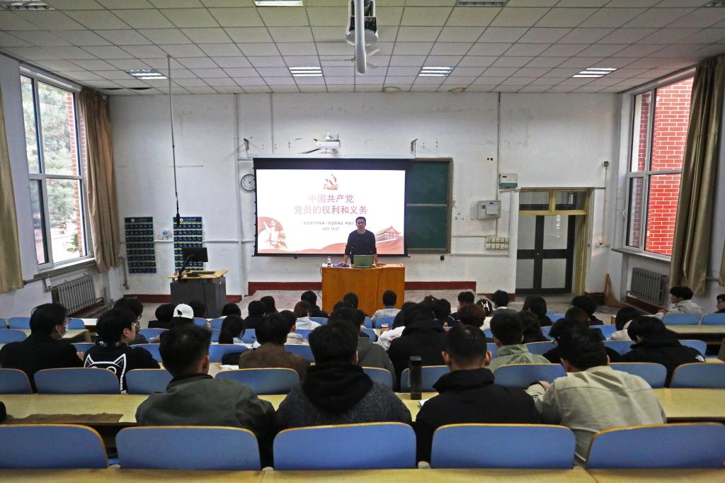 10月27日,资源学院学生第一党支部书记、辅导员牛会功在1A107教室为学院第43期入党积极分子讲授“中国共产党党员的权利和义务”专题党课。