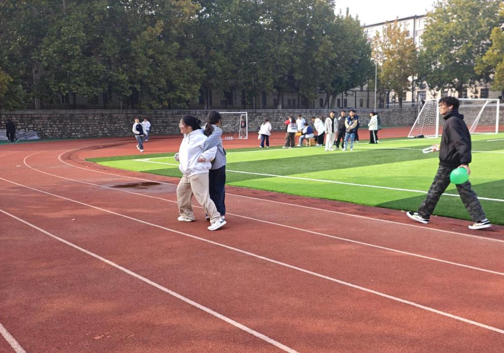 此次趣味运动会共包含“你划我猜”、“小型保龄球”、“三人四足”、“背夹球”、“抱团取暖”、“气球大战”六个比赛项目。现场气氛热烈,同学们全情投入。其中“三人四足”格外考验默契,队员们互相扶持、齐声喊号,尽管步伐受限仍协力向前,引得场边阵阵加油助威。“你划我猜”中比划者手脚并用、表情丰富,猜题者紧盯细节、心领神会,默契配合不时引发欢笑。压轴的“气球大战”更是将气氛推向高潮,快速躲闪与清脆爆破声交织,现场化作一片欢乐的海洋。