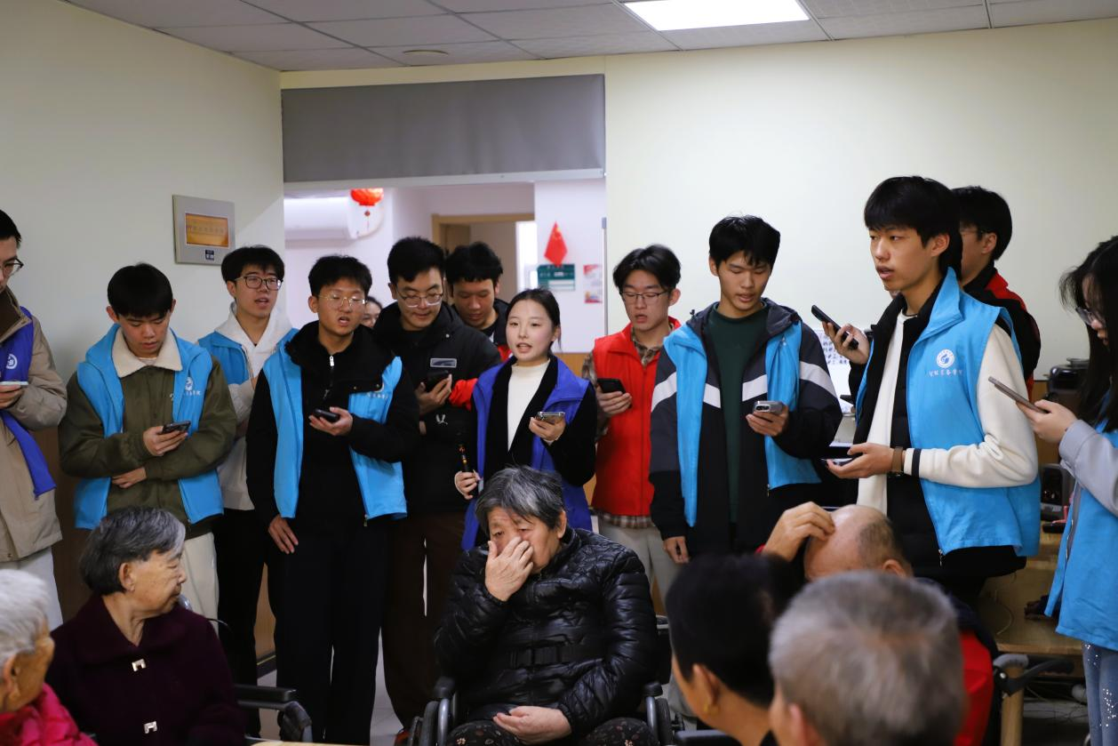 同学们以小组为单位,依次将老人从休息室悉心搀扶至活动场地,耐心询问老人的日常生活与身体状况,大家其乐融融。随后,大家齐声高唱《我和我的祖国》《歌唱祖国》等经典红色歌曲,一位老人深受感染,主动献唱《东方红》,将整场活动推向高潮。团支书周永涵随后带来一段欢快的舞蹈,老人们随着节拍拍手互动,养老院内洋溢着温馨与欢笑。同学们还精心准备了手写贺卡,为老人们送上真挚祝福。