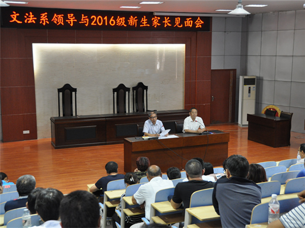9月10日,文法系在模拟法庭举办系领导与2016级新生家长见面会,系党总支书记马福泉、主任张学银出席此次见面会,120余名学生家长参加。