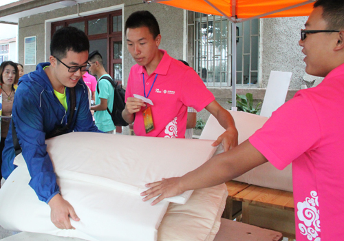 志愿者们开朗明媚的笑容。 新生在志愿者的引领下领取被褥。