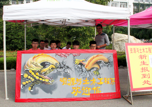 9月9日,部分16级新生提前到校,资土系在校南门口设立迎新点,为同学们提供报到服务。