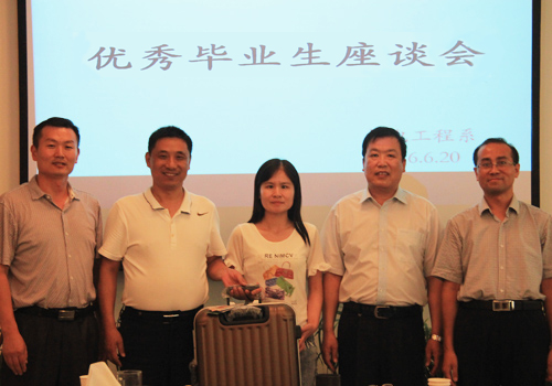 座谈会上,张建中肯定了优秀毕业生在校期间取得的成绩。他希望同学们戒骄戒躁,拼搏进取,以科大杰出校友张玉卓、顾大钊为榜样,登上科大“荣誉墙”。刘然慧希望毕业生牢记“惟真求新”的校训,秉承科大人“认真、勤勉、敬业、务实”的优良品质,为科大良好声誉的积累作出自己的贡献。殷永贵希望同学们把理想当作成长的引路牌,把终身学习作为成长的加油站,以积极的心态适应新环境,尽快完成角色转变,书写更加精彩的人生。会议中,毕业生们敞开心扉,畅所欲言,为学校的发展献计献策,对学校和老师的悉心培养表示感谢,并表达了毕业后建功立业,为母校增光添彩的决心;同时,系领导为志愿服务西部学生王文平颁发纪念品并合影留念。(文:刘钦兴 李永乐 图:纪士鑫 编辑:赵志军 周潇)