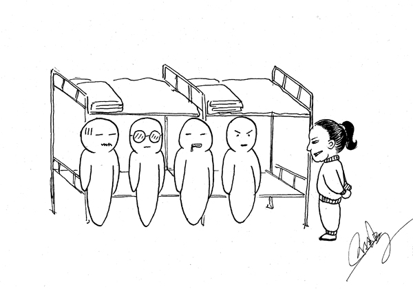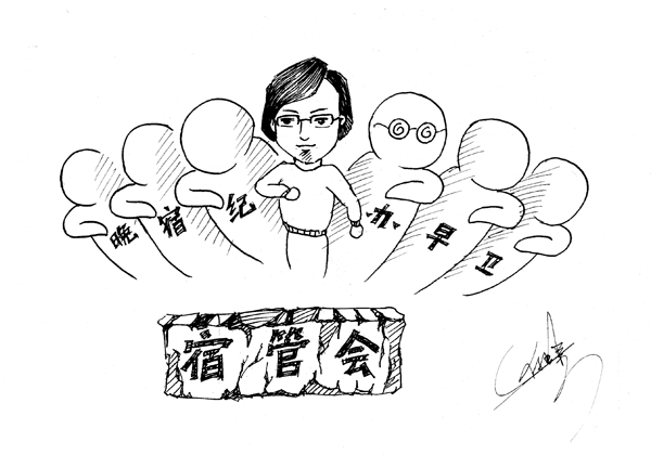 图(6):“早签完了补个回笼觉是不是?”洒艳老师,学生会秘书长,在对宿舍的突击检查中,令同学们“措手不及”。其中的尴尬谁又能了解呢……