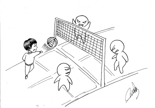 图(9):英姿飒爽,身手矫健,张裴老师排球场上沉着冷静,垫球、传球、扣球,实乃巾帼之英姿,排球传前后,安能辨我是雄雌!