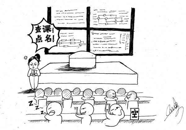图(7):“张田老师要点名了,大家快看看谁还没来……”“嗯?我怎么听到同一个声音答到两次啊,抓紧时间打电话把他给我叫来上课,否则我很生气,后果很严重!”高出勤率、高课堂效率是为一段佳话。