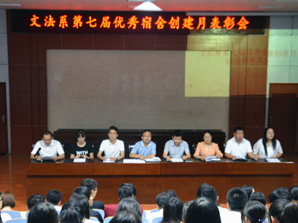6月7日,文法系第七届“优秀宿舍创建月活动”表彰会在模拟法庭举行,校区、学院学生处教宿管理中心主任宋明永,文法系团总支老师、学生会主席团及宿舍代表参加,会议由文法系团总支老师刘明远主持。