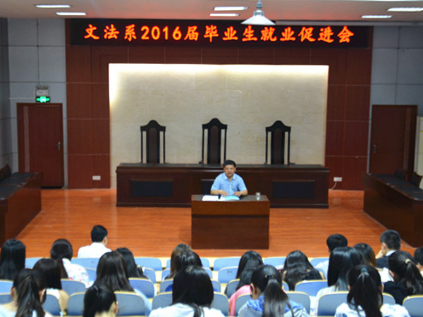 6月1日,文法系在模拟法庭召开2016届毕业生就业促进会,文法系党总支副书记兼副主任刘相明,团总支书记郭涛林、团总支老师郭艳培及全体毕业生参加。