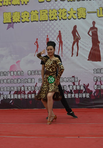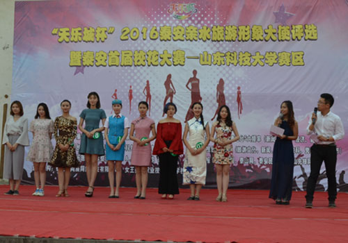 5月21日,由泰安广播电视台、泰安天乐城景区主办的“天乐城杯”2016泰安亲水旅游形象大使评选暨泰安首届校花大赛分赛在山东科技大学泰安校区东校园“青未了”文化广场上演精彩比拼。中国曲艺牡丹奖、文化部群星奖获得者、曾登上央视春晚舞台的泰安电视台八点开拉节目主持人孙程刚,著名主持人、资深评委王艳,泰安舞蹈家协会舞之灵舞蹈培训学校校长李倩出席并担任评委。