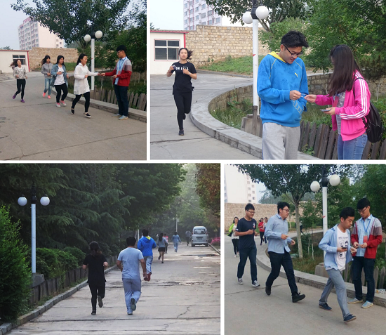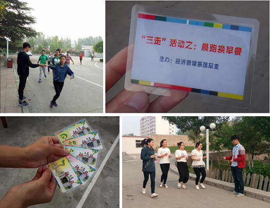 每天工作人员在校园不同位置发放“早”“餐”“我”“来”“了”环校园跑标识牌,在环校园跑时,只要集齐所有标牌并签到即可获得运动积分,每天前50名同学还将赢得免费牛奶、豆浆、蒸包、粽子、水果等运动早餐。同学们在晨跑过程中结伴而跑,相互帮助,彼此鼓励。