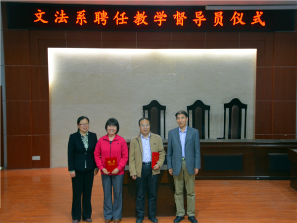 5月3日下午,文法系在模拟法庭举行教学督导员聘任仪式,全体教职工参加仪式。
