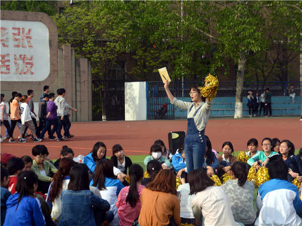 秘书学13-1班的陈洁担任此次开场舞的总指导,开场前的“文法加油”字样、字母“WF”变换和最后花朵的造型令人眼前一亮,这些都是陈洁的创意。雨后的操场上传来“你们做,我也做”,陈洁以身示范,在雨后潮湿的草地上带领大家做动作。