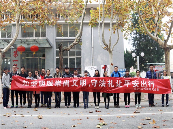 本次活动以“知荣明耻崇尚文明,守法礼让平安出行”为主题,将人流密集的一号餐厅前作为协会宣传的主阵地。此次活动形式上分为主题宣讲和条幅签字两部分,活动前期,泰山文化传承研究会通过专题展板、QQ空间、微信朋友圈等线上与线下相结合的方式进行宣传,不断扩大宣传力度,引导尽可能多的学生参与到活动中来。在活动进行时,志愿者们纷纷向路过的同学宣传文明出行的理念,分发《文明出行倡议书》,并引导他们在条幅上签字,一笔一划,都是他们内心最真挚的承诺。值得一提的是,泰山文化传承研究会充分发挥环保意识与创新意识,在《文明出行倡议书》背面附上了泰安旅游景点线路图,这样不仅增强了文明宣讲的效果,同时也提高了单页利用率,使此次活动最大程度地取得了成功。
