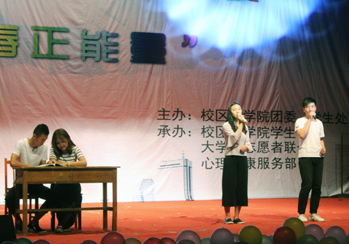 本次心理情景剧大赛以“青春正能量”为主题。经过各系的层层选拔和老师们的精心推送,共有6部心理情景剧突出重围并华丽上演,比赛选手们从大学生生活、学习、工作等方面着手准备,力求将自编、自导、自演的情景剧表演呈现给大家。比赛中,选手们将感情融入在角色中,用欢笑、泪水演绎着大学生的心理成长历程。他们的表演主题明确、内容新颖、场景转变跌宕起伏,受到了评委老师的一致好评。充满正能量的《上课啦》带观众们遨游大学课堂,饱含哲理引起观众共鸣。《墨镜墨镜告诉我》重现现实生活,告诫大学生要倾听自己的声音不要在意别人的眼光,要敢于摘下墨镜做真正的自己,将现场气氛引向高潮。最终,比赛在歌曲《相亲相爱》中完美落幕。
