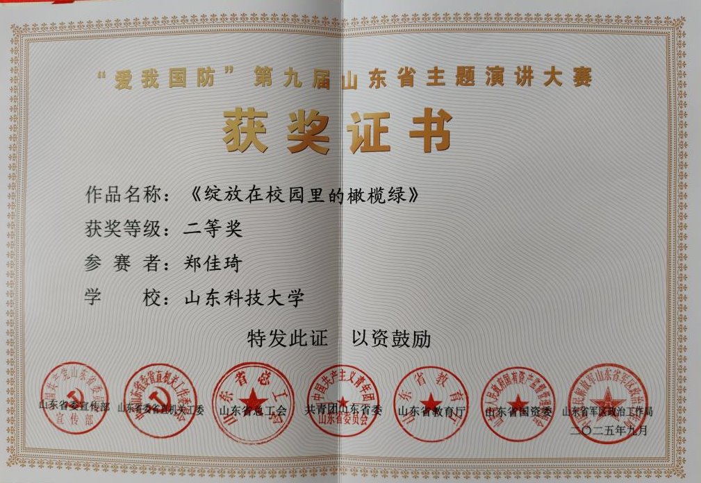 近日,山东省委宣传部、山东省教育厅、山东省军区政治工作局等七个部门联合举办的“爱我国防”第九届山东省主题演讲大赛结果揭晓。我校财经学院审计学23-1班郑佳琦同学凭借出色表现,荣获大赛二等奖,创下校区在该项赛事中的历史最佳成绩。