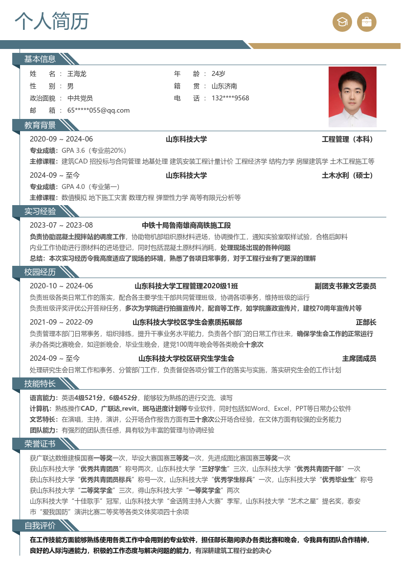 本次大赛面向校区全体在校研究生,参赛选手结合自身专业背景、目标行业与求职意向,围绕基本信息、实践经历、技能特长等核心内容精心制作个人简历,充分展现专业能力、科研素养与职业规划意识。经过评审,资源学院杜婕妤获一等奖;财经学院贺睿琪、智能装备学院石晨获二等奖;资源学院朱俊霖、王海龙,智能装备学院张启磊获三等奖。