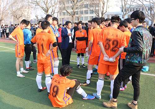 中场休息,系党总支副书记朱景星在比赛现场进行战术指导,为球员们加油打气。