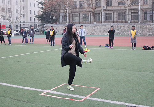 在工作人员准备好场地后,测绘17-1等四个班级率先进行比赛。第一个项目“十人九足”中,经过不断的练习,各个班级都拿出他们不同的比赛策略:或奔跑起来力求速度,或稳中求进避免失误加时。对于赛中出现的失误,同学们也毫不慌张,齐心协力解决后,继续前进。接下来的“毽随心动”中,同学们谨慎应对,灵活处理风力及风向影响,并与队友默契配合。最后的“蜻蜓点水”项目中,七位同学相互配合,灵活绕过三个障碍物,以S型队伍单脚跳跃,迅速前进。