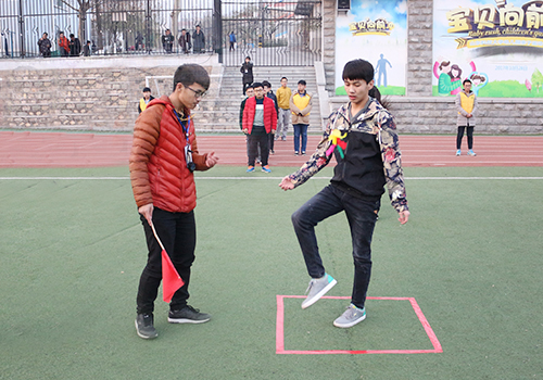 在开幕式后,比赛正式开始。此次比赛分为“十人九足”、“毽随心动”和“蜻蜓点水”三个环节。赛前,裁判介绍了比赛规则并演示活动流程。第一环节中,20名参赛队员站成一排,相邻两人用丝带将腿绑紧,凭借默契配合齐步前行。部分班级由于速度过快,导致丝带断裂,但他们毫不慌乱,立刻调整状态,统一步伐,继续前行。在第二环节中,队员们站在指定范围内依靠踢毽接力完成比赛,参赛队员们身姿灵活、技术娴熟,一个个毽子准确踢出成功与队友衔接。在最后的“蜻蜓点水”环节中,队员们训练有素,左手搭肩,右手提脚,相互通过“S”型路线顺利避开三个障碍物到达终点。