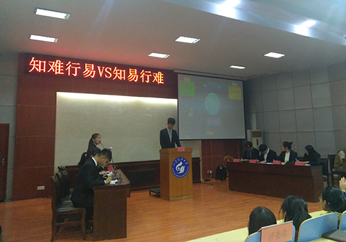 比赛中,正反双方围绕“知难行易还是知易行难”这一辩题进行激烈辩论,资土系代表队作为反方就“知易行难”这一观点与信息系代表队展开激烈的辩论。正方一辩陈词结束后,我方一辩思维敏捷,在知易行难是人类改造自然的必然规律、是科学发展的一般步骤两方面论述我方观点。在一对一攻辩环节,我方二辩、三辩面对正方提问做出机智灵活的回答,并及时发问,不给对手喘息的机会。自由辩论环节,我方辩手缜密的逻辑、清晰的表达、强大的气场,赢得了场下观众的阵阵掌声,并将比赛推入高潮。最后,我方四辩潘雨彤凭借幽默而又缜密的语言对对方辩手的逻辑漏洞进行逐一还击,并从生活、道德和科学这三方面进一步论证我方观点,坚定我方立场。