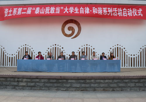 10月12日下午,资土系在文化广场举行“泰山我敢当”大学生自律·和谐系列活动开幕式,校区、学院学生处副处长韩子玉,系党总支副书记朱景星,系团总书记程家国,学生处陈帅老师,辅导员老师张运忠、尹发利、张裴、鲁月出席,开幕式由系学生会秘书长刘绪峰主持。