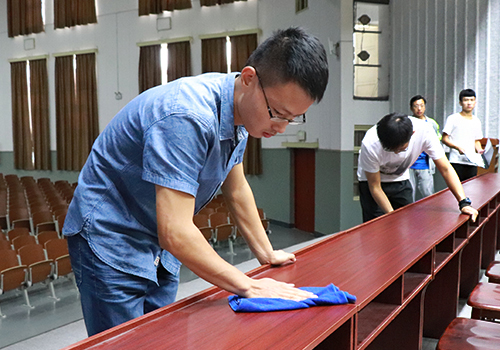 迎新工作刚刚结束,资土系学生会再次进入到迎新大会的忙碌之中。9月9日下午,资土系学生会全体成员在大礼堂集合,为明日举行的迎新大会进行会场清洁与布置。
