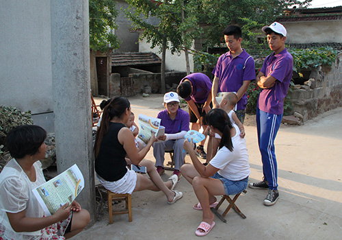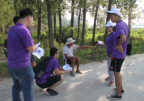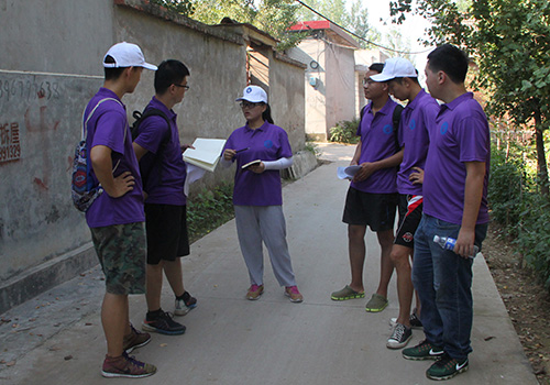 队员们通过发放宣传单和调查问卷的方式收集村民对新农村政策的看法个建议。